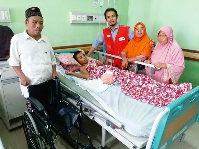 Perhatian PMI dalam upayanya membantu korban gempa terus ditingkatkan dan bersinergi dengan semua pihak. Salah satu yang tak lepas dari perhatian PMI Kabupaten Lombok Utara (KLU) adalah Muis AL Azis, 16 tahun dari Dusun Atas Lendang Desa Nayar Kec. Bayan. Ia adalah salah satu anak yang terkena dampak bencana alam seminggu yang lalu. Saat ini kaki kanan Azis sudah dilakukan amputasi di RSUP NTB. Diketahui, Azis pada saat kejadian gempa berda di lokasi Pelabuhan Cari Bayan sekitar pukul 06.00 Wita. Guncangan gempa mengakibatkan kaki Azis terjepit di pelataran pelabuhan dan harus diamputasi.