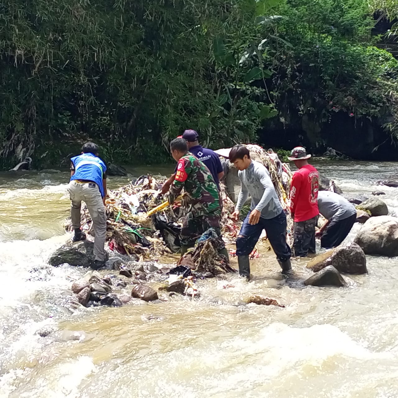 Pada kegiatan karya bhakti yang dilaksanakan, tampak para peserta semangat dan antusias mengangkat sampah di tengah-tengah aliran yang cukup deras serta membersihkan tanaman liar dan ilalang di bantaran sungai yang berpotensi mengotori daerah aliran sungai.