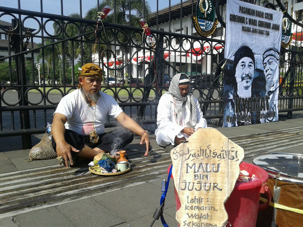 BANDUNG – Dua seniman Bandung, Kyai Matdon dan Taufik (Kyamat), menggelar aksi teatrikal di luar halaman Gedung Sate pada hari, Rabu (30/8/2017), dengan tema Politik itu Gembira.