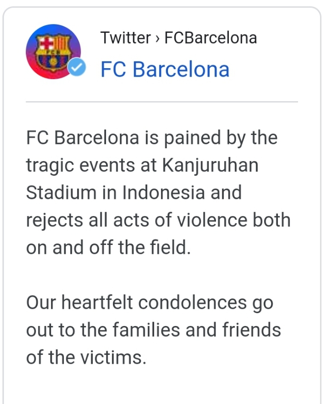 Terhadap kejadian ini, FC Barcelona menyampaikan dukacita yang diunggah melalui akun twitter-nya yang menuliskan “FC Barcelona is pained by the tragic events at Kanjuruhan Stadium in Indonesia and rejects all acts of violence both on and off the field. Our hearfelt condolences go out to thr families and friends of the victims (FC Barcelona berduka atas peristiwa tragis di Stadion Kanjuruhan di Indonesia dan menolak segala tindakan kekerasan baik di dalam maupun di luar lapangan. Belasungkawa tulus kami sampaikan kepada keluarga dan teman-teman para korban),” tulisnya.
