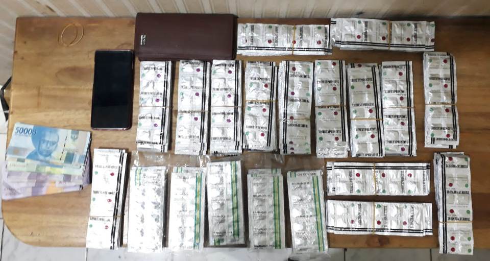 Polisi berhasil mengantongi 1.400 butir jenis Trihexyphenidyl, 500 butir obat jenis Tramadol HCI, uang hasil penjualan sebesar Rp 350.000, dan ponsel merk Samsung warna putih beserta sim card yang ditemukan didalam dus warna cokelat yang berada diatas tempat tidur, di dalam ruangan kamar tidur.