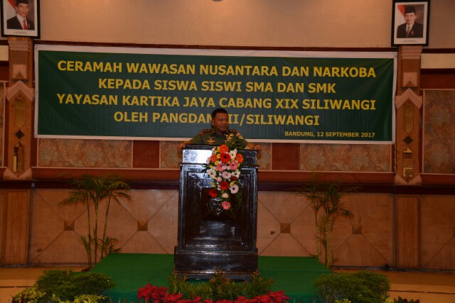 BANDUNG,- Pangdam Siliwangi Mayjen TNI M. Herindra memberikan pengarahan kepada sekitar 1.800 Siswa Siswi SMA dan SMK Yayasan Kartika Jaya Cabang XIX Siliwangi tentang Wawasan Kebangsaan (Wasbang) dan Bahaya Narkoba di Graha Manggala Siliwangi Jalan Aceh Kota Bandung, Selasa (12/9/2017).