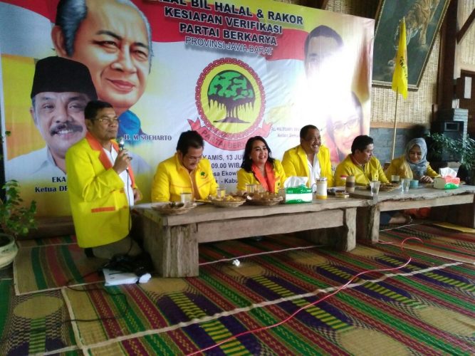 KAB. BANDUNG – Politisi Senior Eka Santosa yang sejak Juni 2017 berkiprah sebagai Ketua DPW Partai Berkarya Jabar, saat acara Halal Bihalal & Rakor Partai Berkarya (13/7/2017), di Alam Santosa Pasir Impun Kabupaten Bandung, melontarkan seloroh “serius” dihadapan 27 pengurus DPD se Jabar, “Malu, kalau ada pengurus partai oon (bloon- tak cakap. red) dan cermat mengurus verifikasi faktual KPU pada Oktober mendatang”. Sontak puluhan hadirin yang hadir di area bangunan tradisional Sunda bernama Bale Gede di Alam Santosa, tergelak. Sebagian lagi hadirin yang mayoritas fungsionaris partai Berkarya, malah mesem-mesem menahan tawa.